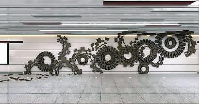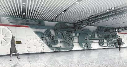 站点风格:提取工业生产中具有代表意义的机械元素,如齿轮、转轴、管道等,以组合、重构的方式展现在观者面前。另外,将长春工业机械制造的历史凝聚为文字,雕刻于背景墙上。整体设计意在展示长春厚重的工业文明,激发长春人民的城市文化归属感和认同感,讲述工业带给这座城市的点点印记。