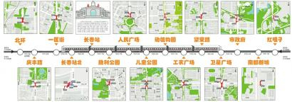 站点风格:采用了散点透视构图法,以“长春厅”到当代的这段时间为轴,生动地再现了有着上千年历史的伊通河两岸的城市面貌和市民生活的场景。既刻画了母亲河两岸丰富多彩的市井文化,同时也跨越了历史的维度,以清末的马市、豆市,老火车站、长春电影制片厂、胜利公园的毛主席雕像、人民广场的纪念碑、中国人民解放军四六一医院等代表不同历史发展时期的典型城市景观为点,以人文风貌以及建筑特征的变迁为线,鲜活地体现了长春这个北方窗口城市在政治、经济、文化、贸易和交通等方面在东北亚地区的重要性,串联起了长春的历史与今天。