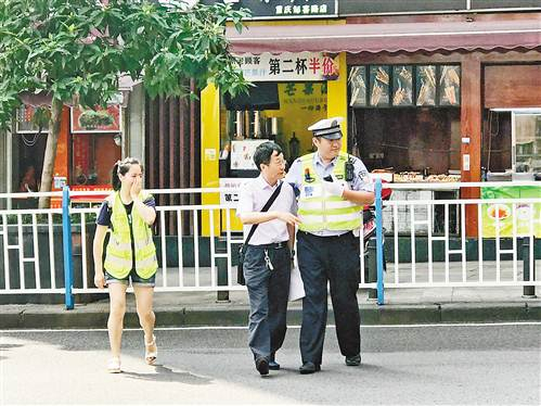 穿上反光背心成为劝导员的行人(左),在民警带领下开展文明劝导活动。记者 张珺 摄