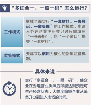 所谓“多证合一”,是指工商(市场监管)部门核发营业执照后,申请材料和审核信息在部门间共享,企业无需到相关部门现场申请,即可领取加载统一社会信用代码和企业信息公示二维码的营业执照。相关行政许可和备案信息均整合在营业执照的二维码上,企业可不再领取相关纸质证件,直接开展生产经营活动。因开展业务等原因确有需要的,企业可到相关部门直接领取纸质证件,相关部门不再要求企业重复填报信息或提交材料。