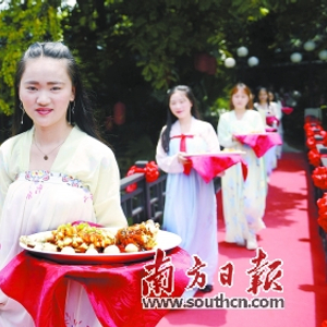 身穿汉服的“侍女”展示红云宴美食。南方日报记者 肖雄 摄