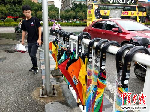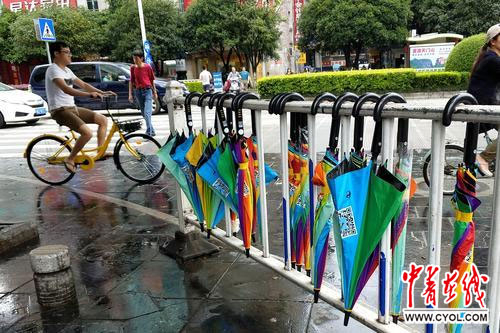 中青在线桂林7月1日电(中国青年报·中青在线记者 谢洋)今年6月,2万把共享e伞出现在桂林市中山路、滨江路、漓江风景区等繁华地段的路口或公交站台旁。和共享单车一样,市民只要扫码下载APP注册,在APP上输入雨伞编号后,就可获得开伞密码,从而借伞使用。