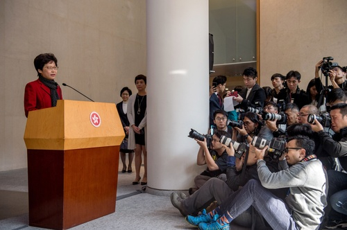 2017年3月27日,刚刚当选香港特区行政长官的林郑月娥召开记者招待会。