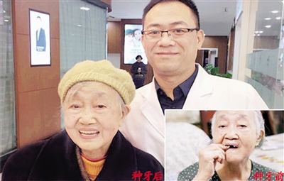 | 右图:种牙后,老人开心展示完美新牙。 |