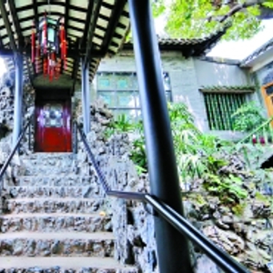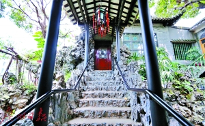 贵宾楼的台阶是用英石砌成的,从外面看,就像人在石山里走一样。