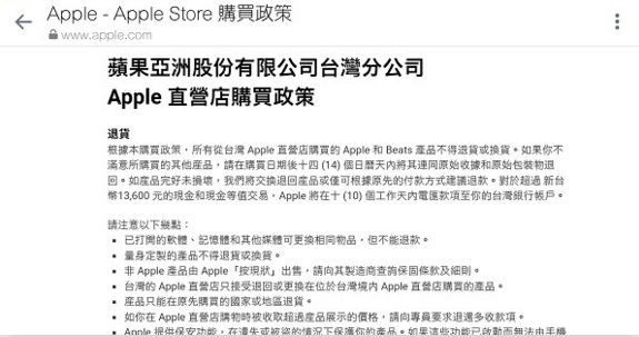 根据苹果官方网站所公告的台湾地区Apple直营店购买政策,从网页上可以看到,确实是有清楚地列出“所有从台湾地区Apple直营店购买的Apple和Beats产品不得退货或换货。”