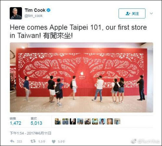 在台湾的苹果直营店是其全球第497家分店,这次苹果台北直营店以“树”为主题,用巨幅剪纸艺术呈现“相聚的美好”,引用台湾传统习俗:在过往的农业时代,台湾各村庄总会在村头的榕树下准备一壶茶,让经过的旅人口渴时饮用,旅人稍作休息之后,再继续步上崭新旅程。苹果此次引用台湾本地传统,希望台湾人能够在此交流、同乐、再出发。