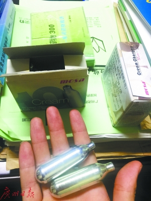 近日,有市民称在广州的一些娱乐场所内发现“笑气弹”的身影。还有市民表示,在海珠区一个酒店用品批发市场内的部分厨具和烘焙用品店内可以轻易买到商品名称为“氧化亚氮”的“笑气弹”,价钱约45~65元一盒,销售的对象多为开咖啡店或餐厅的餐饮业人员。