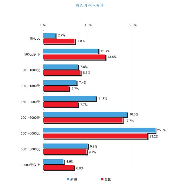 数据显示,月均收入在5000元以上的网民占比为14.5%,略低于全国平均水平16.6%,月均收入在1500-5000元的用户占比为55.4%,比全国平均水平的48.6%要高。