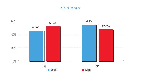 经调查,新疆网民的男女比例为45.6:54.4,女性网民比例明显高于男性。与同期全国全国平均水平52.4:47.6比较发现,新疆女性网民的占比高出全国平均水平6.8个百分点。