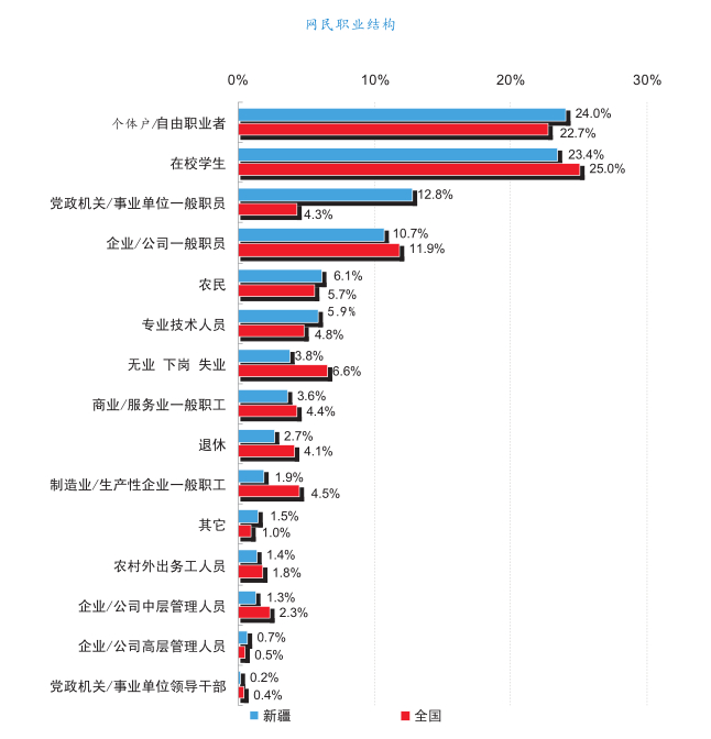 赵志杰说,从职业结构来看,个体户或自由职业者,以及学生是新疆主要上网人群,这与全国平均水平一致,但与全国平均水平不同的是,新疆网民中党政机关、事业单位一般职员的占比明显较高,比全国平均水平高出8.5个百分点。
