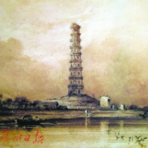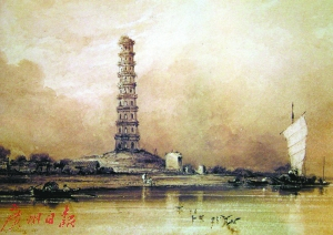 19世纪中,琶洲塔附近的珠江,水上海鸥翻飞。该水彩画由早期来华西方人安东尼·菲尔丁绘制。