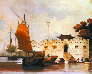 清代,珠江中央的海珠炮台。此时珠江的江面已比以前缩窄了很多。