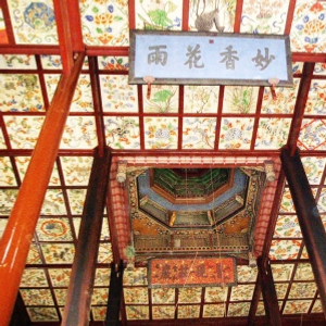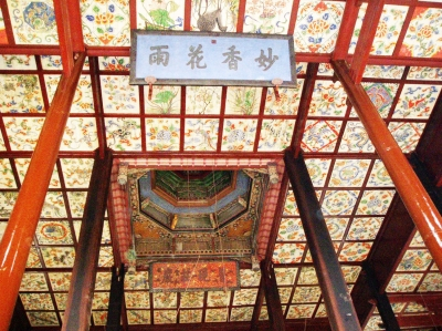天花上满施彩绘,中央有斗八藻井,保存较好,至今仍色彩鲜艳,具有较高的艺术、宗教和文物研究价值,是珍贵的艺术品。另外,大殿中还悬挂乾隆四十八年御赐“普现庄严”和“妙香花雨”匾,均为原物,还保存有清高宗弘历撰写的《万寿重宁寺碑》。