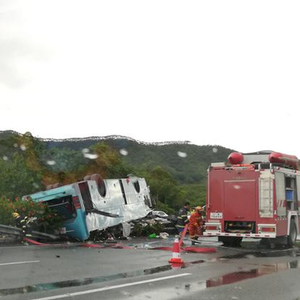 广河高速一辆载四五十人大巴翻车 隔离带被压毁