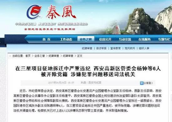 时隔5年之后,三星项目征地拆迁再次出现在公众视野,却是因为违纪。今年4月24日,因在三星项目征地拆迁中严重违纪,西安高新区管委会杨钟等6人被开除党籍,涉嫌犯罪问题移送司法机关。