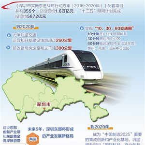 记者注意到,与《深圳市实施东进战略行动方案(2016-2020年)》配套的项目共有355个,总投资约1.6万亿元,“十三五”期间计划完成投资约5672亿元。其中,交通建设是重中之重。《方案》提出,全力推进10大战略通道、6条铁路、14条地铁建设,加快构建东部海陆空铁综合交通体系。到2020年,力争轨道交通运营和开发建设线路超过260公里,新改建高快速路和主干路300公里。实现“10、30、60交通圈”,即10分钟进入快线路网体系,30分钟抵达市中心区,60分钟抵达深圳市全域及东莞、惠州、河源、汕头中心城区。