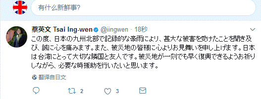 不仅如此,台当局领导人蔡英文还用日语发出了一条向日本九州暴雨灾害表示慰问的推文,大意是“日本是台湾的朋友,台湾会在必要时提供援助”。