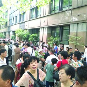 昨日6时20分,记者来到位于徐汇区汾阳路83号的复旦大学附属眼耳鼻喉科医院总院,发现此时医院门口的空地上已经排起了三大条长队,每排队伍都有一两百号人,六七名安保人员正在维持秩序。与此同时,还不断有人涌向医院门口,加入等候挂号的队伍中。半小时过后,空地上已经挤满人,队伍也开始向狭窄的人行道延伸。