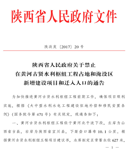 据了解,黄河古贤水利枢纽工程位于黄河北干流下段,左岸为山西省吉县,右岸为陕西省宜川县,下距壶口瀑布10.1公里。根据黄河古贤水利枢纽工程项目建议书,水库拟定正常蓄水位627米。省政府6月19日发出文件,禁止在黄河古贤水利枢纽工程占地范围内实施与该工程无关的新建、扩建、改建项目,已批准尚未开工的项目不再建设,在建的项目停建;禁止开发土地、修建房屋和其他设施,禁止新栽种多年生经济作物和林木等。除出生、婚嫁、军人转业退伍、大中专毕业生回原籍等国家政策允许迁入外,其他人口不得迁入上述区域。违反相关规定的,一律不予补偿。
