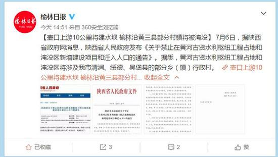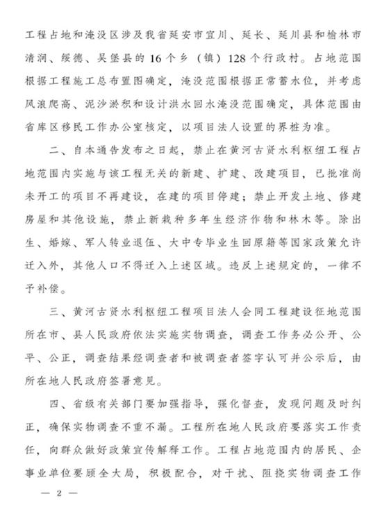 记者日前从陕西省政府网站上获悉,为加快推进黄河古贤水利枢纽工程前期工作,确保项目顺利实施,从6月19日起,陕西省禁止在黄河古贤水利枢纽工程占地和淹没区新增建设项目和迁入人口,涉及、陕西市清涧、绥德、吴堡及延安市宜川、延长、延川等县的16个乡(镇)128个行政村。