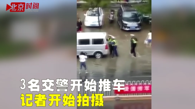 在这条1分47秒的视频中,路边有不少积水,一辆面包车停靠在水上,这时三名身穿交警制服的人走到车辆后方,踩着积水开始用力推车,他们身后,还有一人正拿着摄像机拍摄。车辆在被推出一段距离后,该面包车加速驶离水面。 “忽悠人,人家车好好的,要给人家推,旁边还有记者。”拍摄者在视频内说。