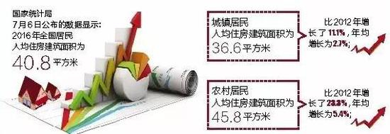 数据显示,2016年全国居民人均住房建筑面积为40.8平方米,城镇居民人均住房建筑面积为36.6平方米,农村居民人均住房建筑面积为45.8平方米。