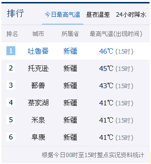 今天的新疆有多热?用“汗流满面”来形容绝对不为过。新疆人民的“热情”绝对不是吹的,从7月9日8点49分至14点,全疆发布了21个高温预警,其中9个高温红色预警。看当日15时排在全国高温的前三名就知道新疆有多热了:吐鲁番:46℃,托克逊45℃,鄯善43℃
