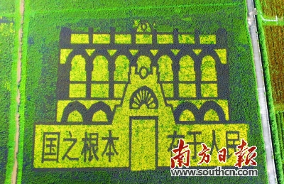 南朗是孙中山先生的故乡,4幅巨型稻田画中有一幅描绘的便是孙中山故居。它以金黄色为底色,暗红色的稻谷穿插其中,勾勒出大门、窗户、廊台等主体结构。在大门的左右两侧,暗红色的稻谷拼成了八个大字:“国之根本,在于人民”。