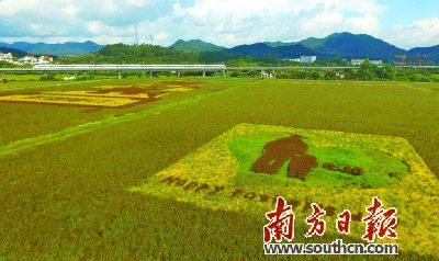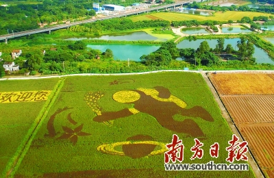 稻田里种出了汉字“幸福崖口”,还勾勒出南朗崖口飘色等精美图案。