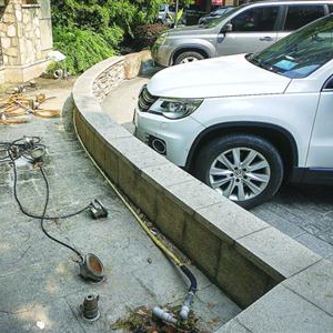 7月11日下午,晨报记者走进小区后,在三辆汽车后面,看到了这个荒废在景观墙下的喷泉——灯具、喷头、电线、水管,暴露在干涸的水池里,池子里早已没有一滴水,积满了落叶和污垢,甚至可以看到到处乱爬的小虫子。