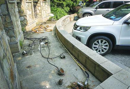 黄浦华庭小区喷泉线路裸露,形同虚设。 /晨报记者 张佳琪