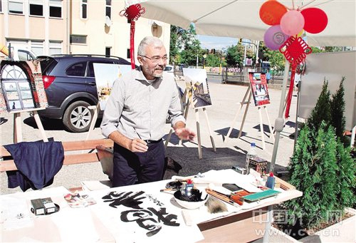 图为保加利亚中国文化爱好者在展示中国书法。 经济日报记者 田晓军摄