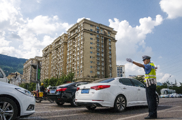 但是,当交通不畅,有所缓堵时,正在巡逻的北碚交巡警陈嘉峰接到指挥中心的指令,迅速赶往云清路,对此路段交通进行疏导,和交通特勤一道“战斗”在这蓝天白云下,对违反交通法规的进行必要的处罚,对过往行人与驾驶员进行交通安全提醒,也请驾驶员注意防暑降温,千万不要中暑哟。