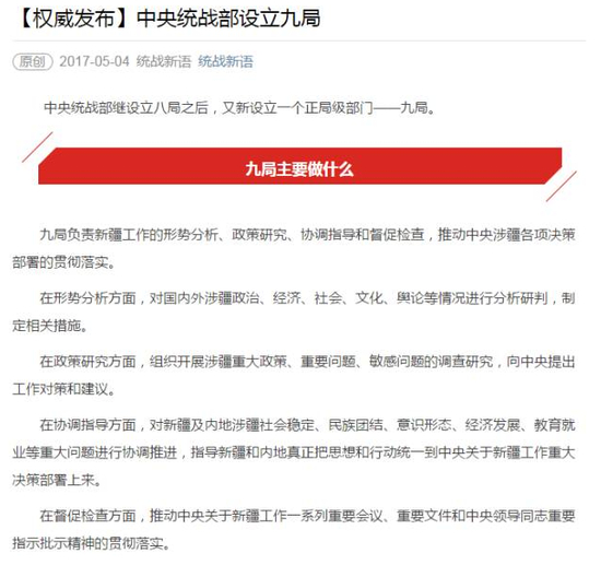 九局的被“曝光”,缘于统战部官方微信“统战新语”今年5月4日的推送,这篇文章介绍了新设立的九局,包括其主要工作、党中央对新疆工作的重视等等。但政知道(微信ID:upolitics)注意到,虽然官方是5月4日公布,但早在2016年8月,就有九局相关领导调研的消息了。