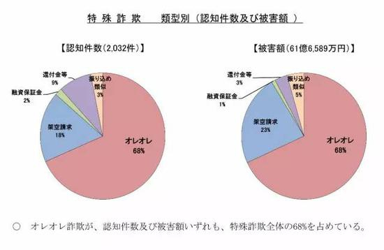 オレオレ(“是我是我”诈骗)68%,架空請求(要求提前缴费诈骗)18%,