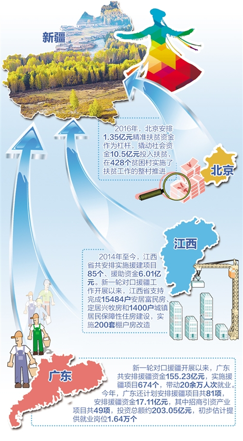 数据显示,新一轮对口援疆开展以来,广东共安排援疆资金155.23亿元,实施援疆项目674个,带动20余万人次就业。今年,广东还计划安排援疆项目共81项,继续安排援疆资金17.11亿元,其中招商引资产业项目共49项,投资总额约203.05亿元,初步估计提供就业岗位1.64万个。(经济日报记者 庞彩霞)