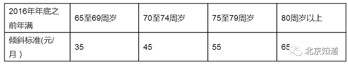 对在2016年底之前已经年满65周岁及以上的高龄退休人员,在按照上述基本养老金调整办法进行调整后,再次享受到35元至65元四个档次的倾斜政策。如下图。