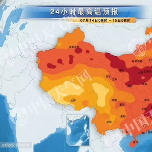 昨日,是此轮高温影响过程范围最广、强度最强的一天。华北、黄淮、西北地区、江南、华南中东部、内蒙古东部、四川盆地等地出现35~38℃高温天气,山西西南部40~41℃,新疆吐鲁番42~45℃。