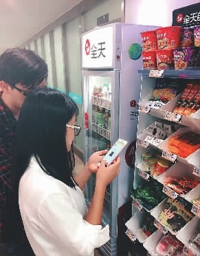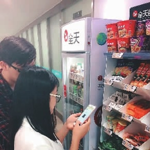“全天Allday”无人便利店其实类似于无人售货机的功能,但形式不一样,全天便利店是全开放式的,消费者可以任意在货架上取货,付费全靠自觉,不需现金,消费者用微信扫码支付即可。