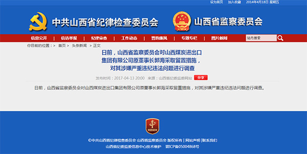 山西省监察委对山西煤炭进出口集团有限公司原董事长郭海采取留置措施,对其涉嫌严重违纪违法问题进行调查。 中共山西省纪律检查委员会 山西省监察委员会 网站截图