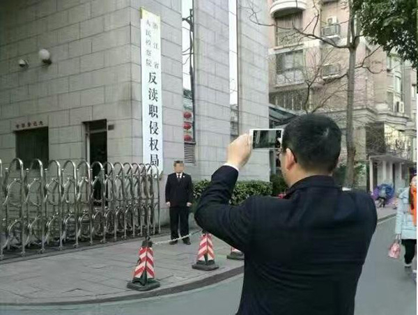 2017年2月3日,立春,这是春节长假后第一个工作日。傍晚时分,杭州文三路上的浙江省检察院门前,聚集了不少人合影留念。