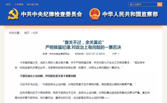 7月13日,中央纪委官网刊发文章,再次强调中央纪委七次全会工作报告中对换届纪律的要求:“对政治上有问题的一票否决”。文章写道,干部在政治上出问题,对党的危害不亚于腐败问题。政治问题是换届的第一关,“首关不过,余关莫论”。