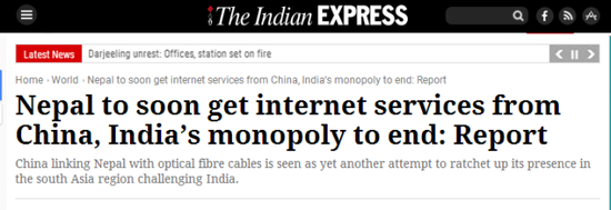昨天,《印度快报》发布了一篇题为《尼泊尔即将从中国获得互联网服务,结束了印度垄断》的报道,报道中说: