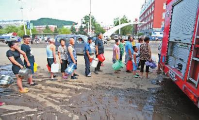 消防官兵用消防车为受灾群众提供生活用水