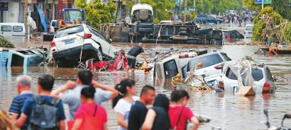 街头,随处可见被冲得东倒西歪的汽车,甚至有的“站立”在路边。东山街与吉桦路交会处本来是平坦马路,如今变成了2米多深的大坑,内有浑浊积水。