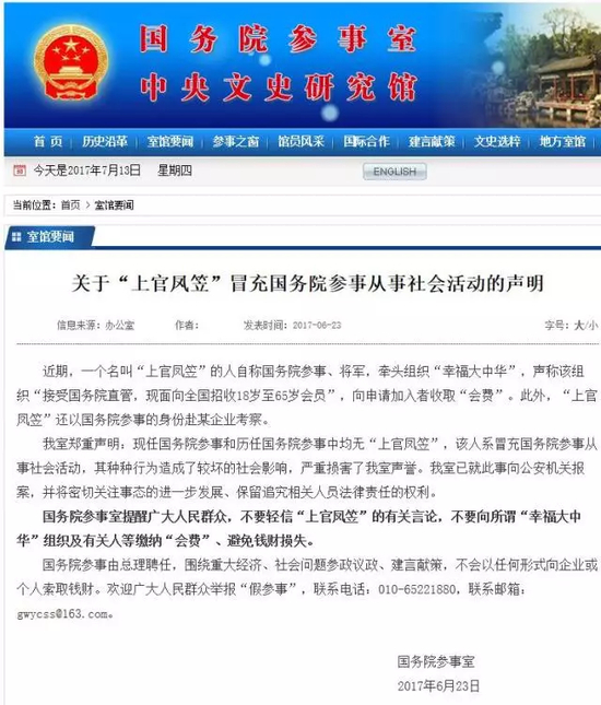 国务院参事室提醒广大人民群众,不要轻信“上官凤笠”的有关言论,不要向所谓“幸福大中华”组织及有关人等缴纳“会费”、避免钱财损失。