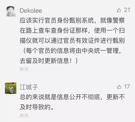 @Dekolee:应该实行官员身份甄别系统,就像警察在路上查车查身份证那样,使用一个扫描仪就可以通过官员有效证件进行甄别(每个官员的信息将由中央统一管理,去留及时更新信息!)