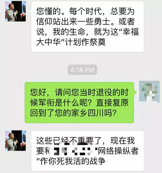 对话中,他先否认自己是将军,一再强调“我只是一名普普通通的退役军人”,然而一直跟我们说自己与“首长们”私交非常好,经常聚会,而且接受过许多“大媒体”的专访。。。。。。