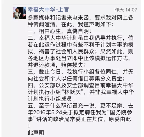 前天下午,上官凤笠的朋友圈更新了一条声明,明确切割了自己和“龙爱量子”老总林跃庆的关系。。。。。